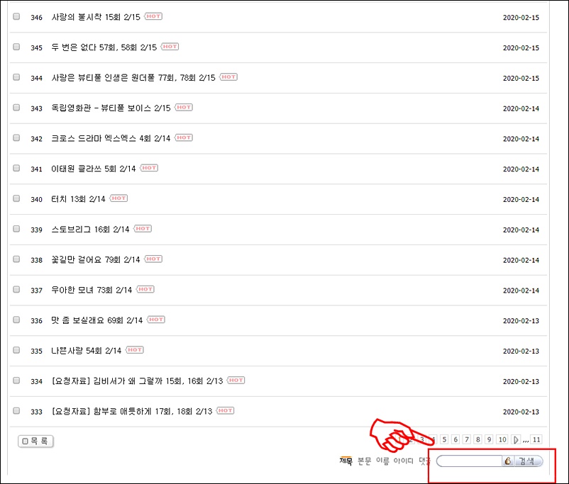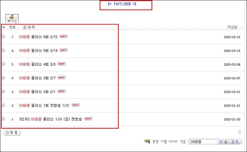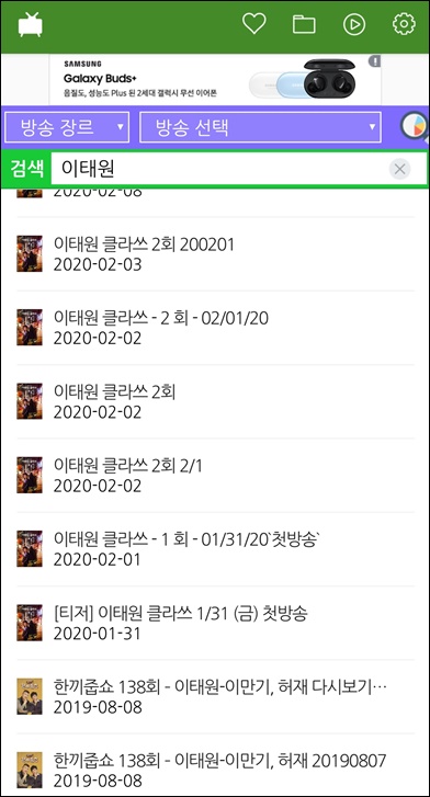 2) 이태원 클라쓰 재방송을 보고 싶으시면, 우측 하단 검색창에 '이태원'을 입력하고 검색을 하시면 하단 좌측 사진과 같이 해당 프로그램 현재까지 상영된 전편이 리스트업 됩니다.